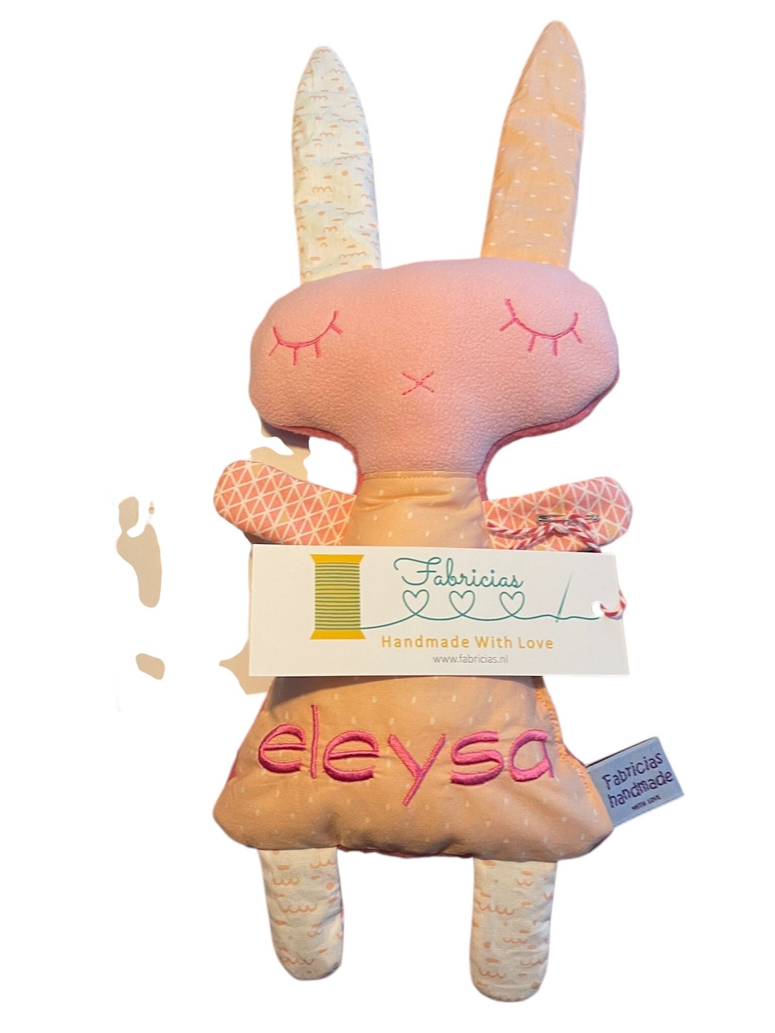 Een persoonlijk cadeautje als je op (kraam)bezoek gaat, hoe leuk is dat. Dit konijn is een echt schatje, verkrijgbaar in de kleur en met de naam die jij wilt. Bestel je gewenste kleur, reken je bestelling af en daarna neem ik contact met je op over je wensen qua stoffen en de naam. Je kunt ook alvast de naam vermelden in het opmerkingenveld in het bestelmenu. Levertijd ca 1 week.